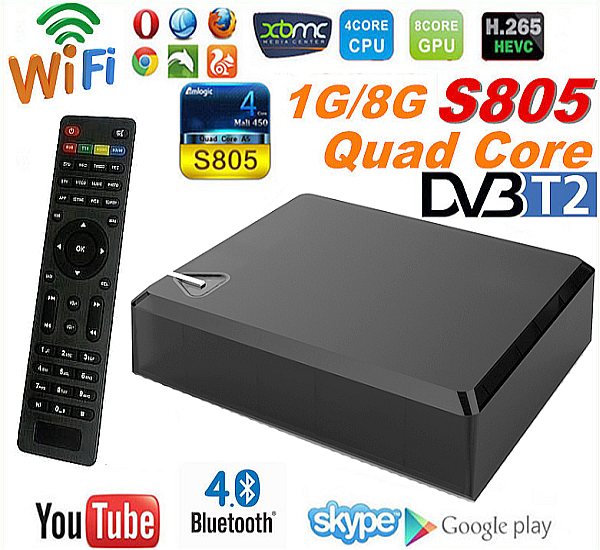 Нові чотириядерні процесори Android Media Box з DVB-T2. Пристрій на базі S805 Amlogic процесора, працює Android 4.4 з XBMC попередньо встановлені і підтримує HEVC (H.265) 1080p апаратне декодування відео.