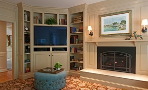 7. Телевізор відмінно виглядає в ніші, головне не забувати про те, що розмір ніші не повинен заважати вільній циркуляції повітря біля телевізора, інакше він може перегоріти від перегрівання. Помістивши телевізор на виступі, ви не тільки забезпечуєте йому хорошу вентиляцію, а й можете красиво оформити з боків виступу полками стелажами.