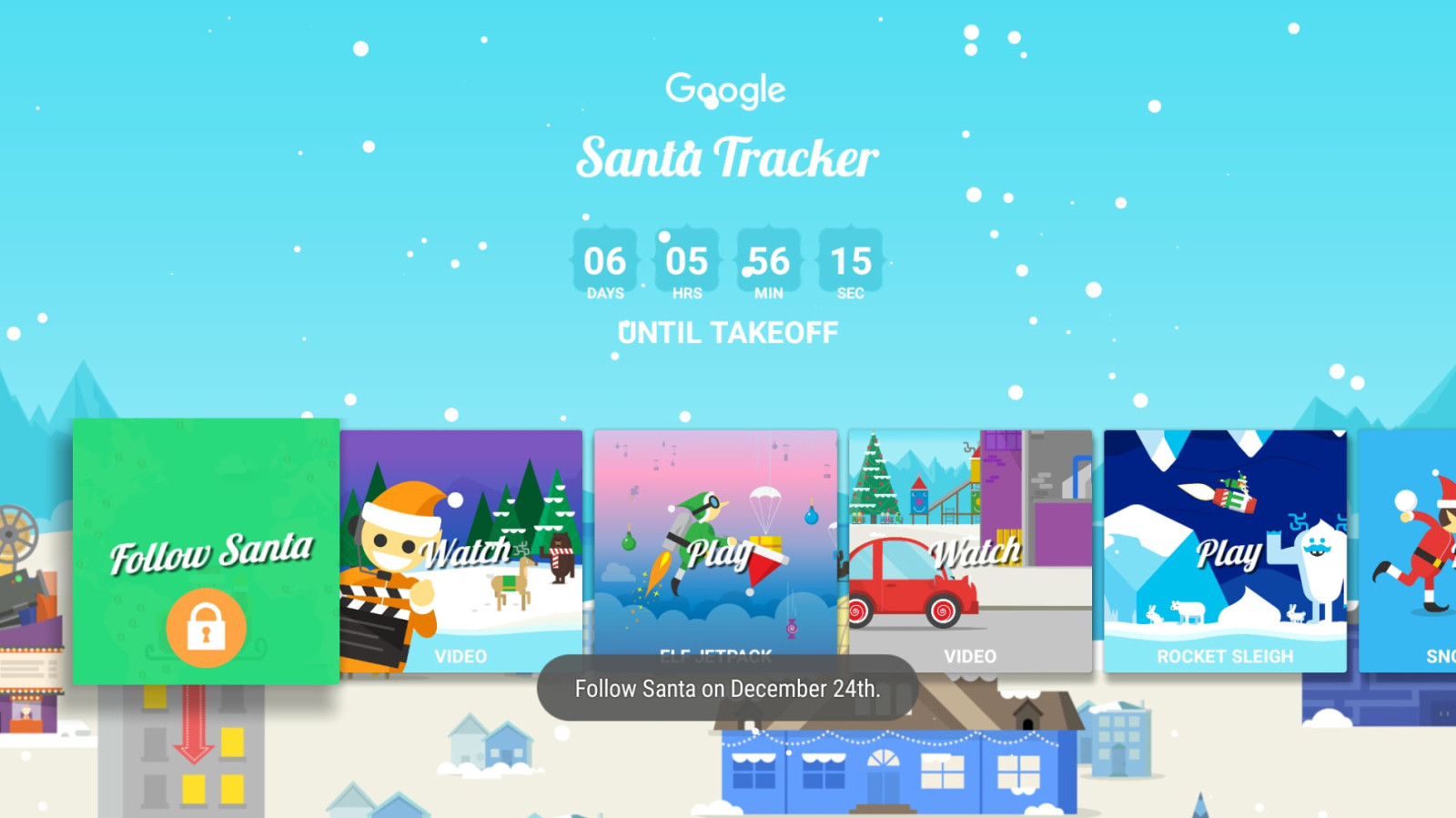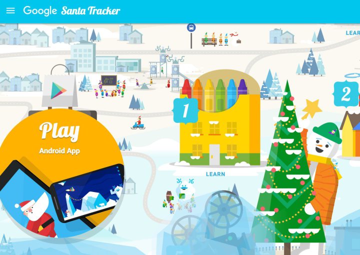 Google Santa Tracker доступний для Android, а також має годинник зворотного відліку до моменту, коли Санта починає свою щорічну поїздку. Додаток має нову гру, перероблену в село, поновлення для андроїд і здатність стежити за подорожжю Санти на Андроїд ТВ. Додаток є безкоштовним для Андроїда.